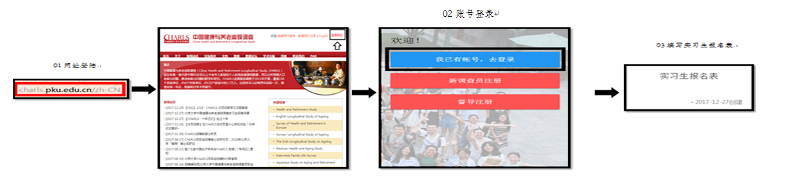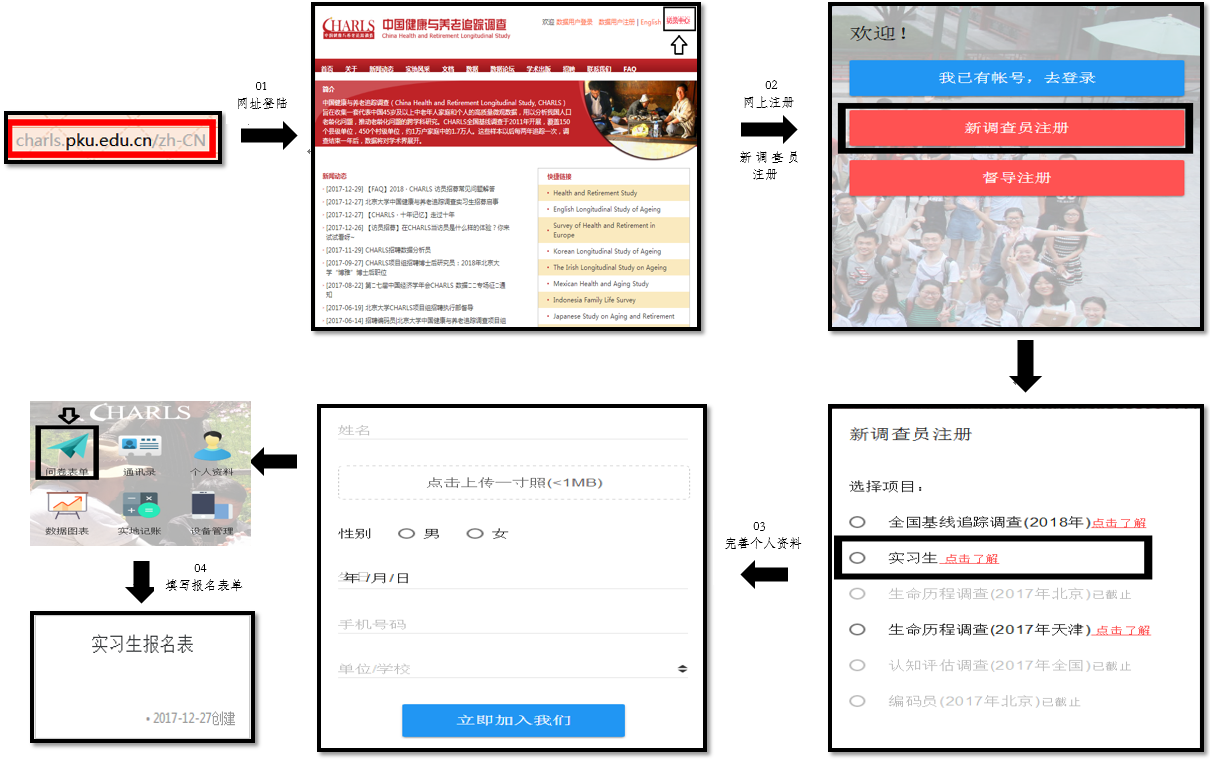 (1)登录 http://charls.pku.edu.cn CHARLS 官网,在主页右上角点击“访员中心”,使用邮箱注册。请注意报名系统中的项目简介和各角色要求,仔细选择报名岗位;注册时须上传电子证件照。