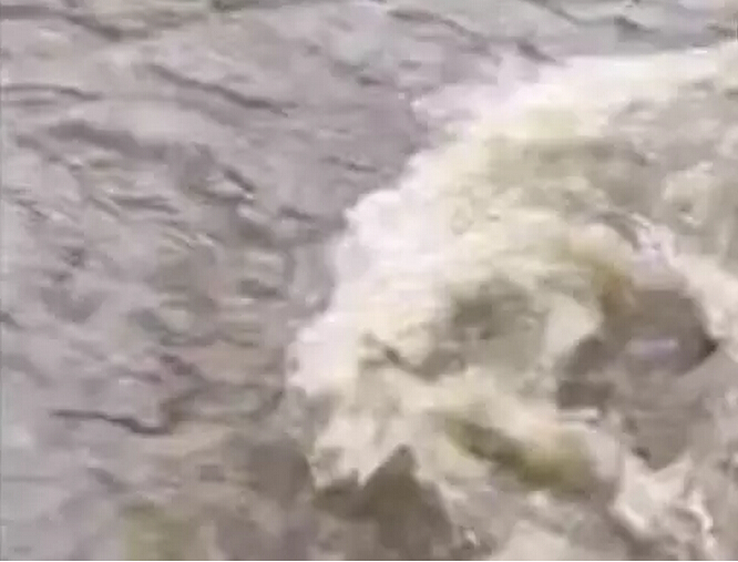 门口的马路变成了一条“河”,还有漩涡与浪花。只有街边的店铺门面,提醒着路人这真的不是条”河“。
