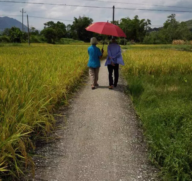 我们也停下了村历史访谈,将老人们送回家。奶奶撑着双拐,与爷爷走在雨中。两个瘦弱的背影紧紧相依,爷爷的手搂着老伴,害怕一不留神,奶奶就会摔倒。不知他们肩并肩地走过了多少条这样的小路,经历了多少人生的风雨。