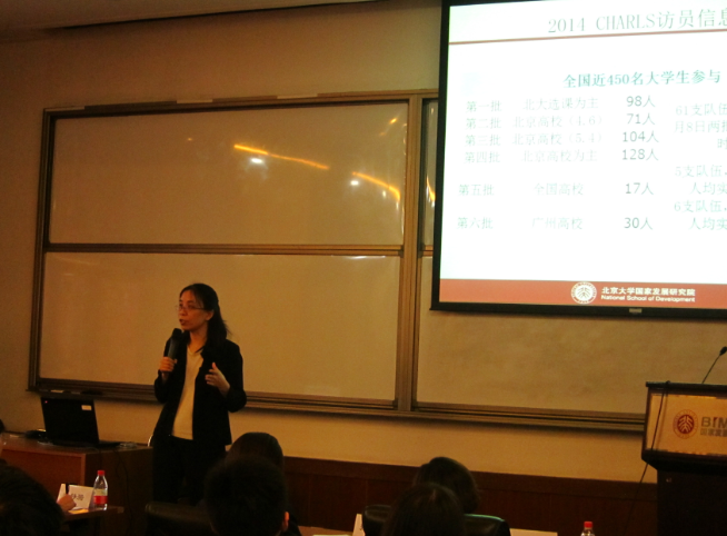 接着陈欣欣老师以幽默的主持风格,请出来一位“访员家长”赵耀辉教授。赵教授为同学们讲述了她自己的儿子参加此次实地调研的一些经历。也站在家长角度,深深的感到同学们在实地的辛苦和努力,真诚地感谢同学们暑假辛苦的收集数据。她还为同学们展示了此次调研数据的一些最新分析结果。同学们看到自己收集来的数据变成了一个个鲜活的数据图,看到通过自己收集来的数据可以做出那么多有趣的研究,都非常的兴奋。同学们回忆起这些数据的收集过程,在赵教授的讲解下更能理解这些来之不易的数据的价值。