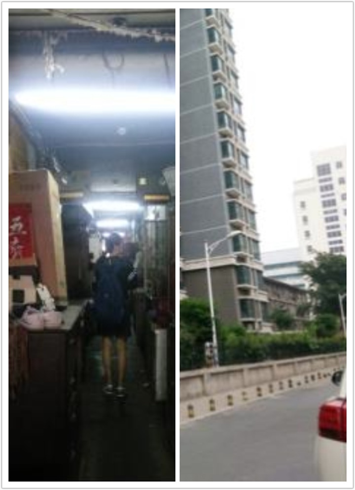 我们的队员两两组合,手握“两岸”“三地”的数十个样本,在居民楼与筒子楼间来回奔走。前一秒还在逼仄的筒子楼里看着“长毛”的电线、积满油烟的房门和安置在走道里的灶台发怵,后一秒就能躲进高层的电梯里享受片刻的阴凉;前一秒是电梯楼的大叔不由分说“嘭”地关上房门,后一秒筒子楼的阿姨热情地迎我们进屋来坐。