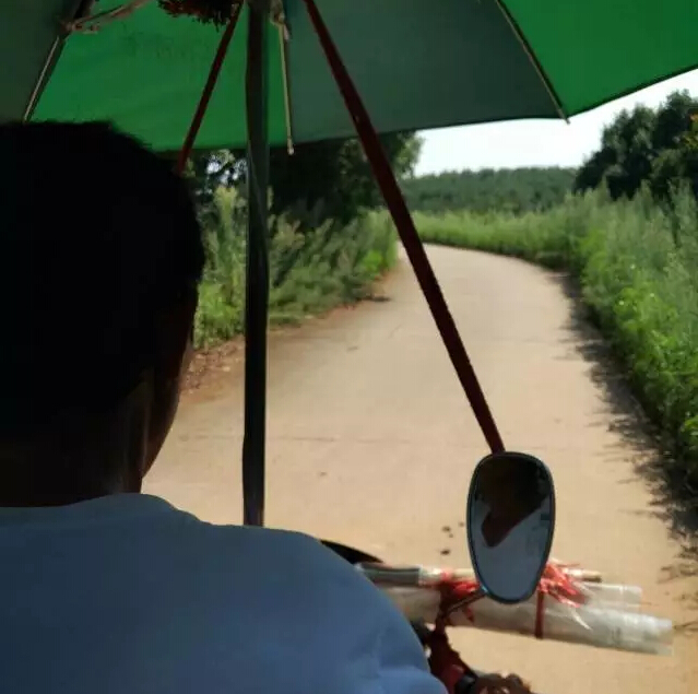 这天天气预报高温40度,为了赶进度,简单吃完午饭,我们就上路了。饭店的阿姨一直在劝我们这么毒的太阳先休息会儿,这样会中暑的。可我们依旧骑上一辆小电动,开在乡间唯一的小路上,踏上了前行的道路。