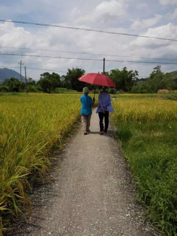 在去座谈会的路上,奶奶打着伞和爷爷并排走,奶奶担心爷爷太太晒,把伞向爷爷头上偏,为他挡住毒辣的阳光。